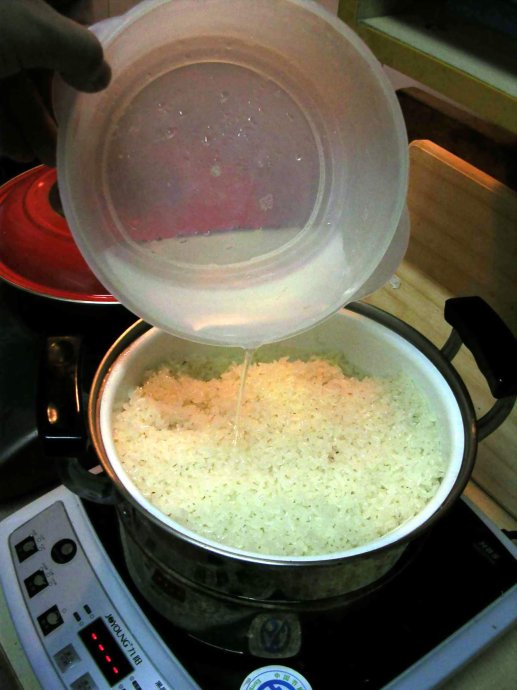 4. 將以上蒸好的澆過水的糯米放入幹淨的空鍋內(剛才蒸煮用的高壓鍋就行),用筷子翻攪,用手摸鍋壁,感覺手溫,這時候將用少許水化開的米酒曲倒入,同時邊攪拌。圖四