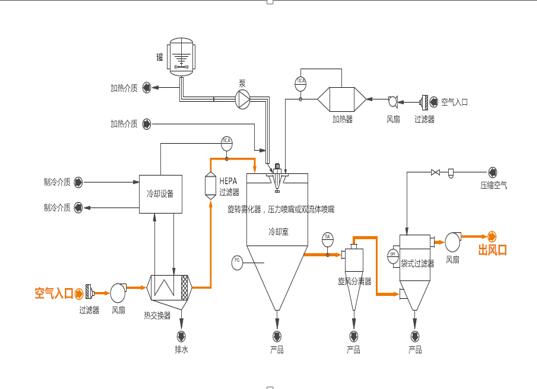 噴霧冷凍幹燥機係統由噴霧塔、噴嘴、加熱裝置、儲液槽、過濾係統、閥門、空氣過濾、鼓風機、冷凍壓縮機、加熱係統、旁路管、為噴嘴所提供的噴霧氣體等組成