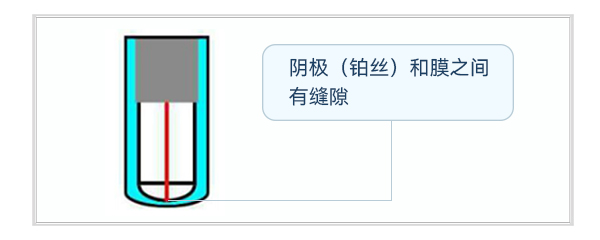 檢查溶氧膜膜片,如果有過度的突起,如下圖示,使陰極不能接觸到膜片,則必須更換溶氧膜。