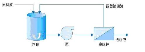 在過濾過程中料液通過泵的加壓,料液以一定流速沿著濾膜的表麵流過,大於膜截留分子量的物質分子不透過膜流回料罐,小於膜截留分子量的物質或分子透過膜,形成透析液。故膜係統都有兩個出口,一是回流液(濃縮液)出口,另一是透析液出口。在單位時間(Hr)單位膜麵積(m2)透析液流出的量(L)稱為膜通量(LMH),即過濾速度。影響膜通量的因素有:溫度、壓力、固含量(TDS)、離子濃度、黏度等。