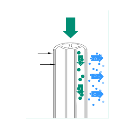 與矽藻土過濾相比,膜過濾主要是一種表麵錯流過濾。固形物被截留在膜表麵或膜的孔隙中。當產品以一定的流速流經膜表麵時,這些固形物被衝走並保持懸浮狀態,因此膜表麵保持幹淨、有效。運行一定時間後膜慢慢被堵塞,這時候必須進行化學清洗。需要過濾的產品流經膜的通道:部分液體透過膜成為濾液(2),而截留液(1)繼續流動。