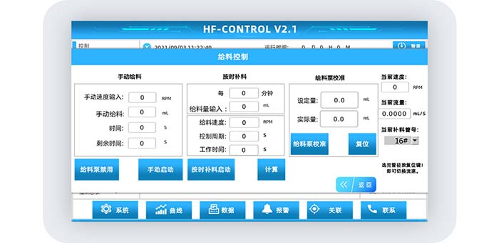 設置手動補料時補料泵的轉速,加入的料液體積,啟動後係統可計算出定速定量後補料泵所需工作的時間,以及顯示補料泵剩餘的工作時間。