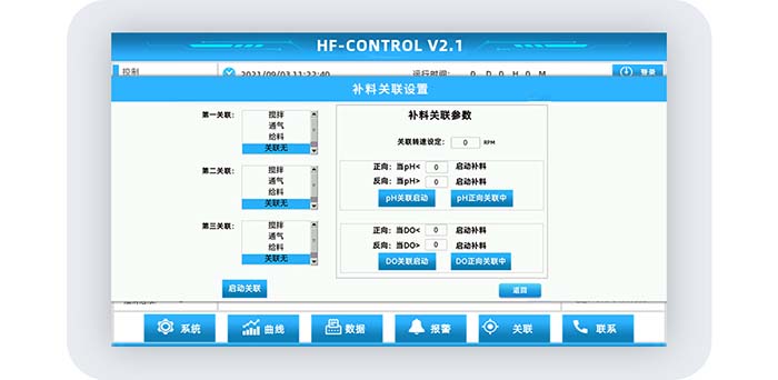 在發酵過程中,輸入所需的關聯轉速,以及補料正向關聯DO或補料反向關聯DO的條件,係統即可進行補料關聯DO,進行多重調節DO,滿足客戶多樣需求。